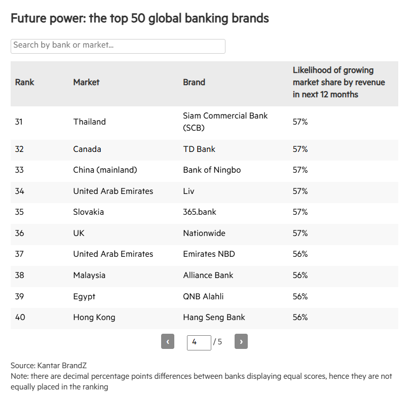 該榜單由凱度(Kantar)和英國銀行家雜志聯(lián)合發(fā)布,根據(jù)客戶感知來評判銀行在未來12個月內(nèi)的品牌價值增速,是否獲得了與其規(guī)模相符的良好品牌資產(chǎn)得分,即該銀行是否正在有效地打造其品牌。